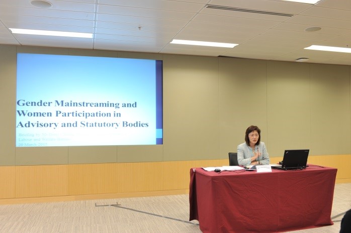 因應行政長官在《二零一五年施政報告》要求所有決策局及部門由2015-16年度開始,在制定主要政府政策及措施時須參考「性別主流化檢視清單」及應用性別主流化,以及把委任女性加入政府諮詢及法定組織的百分比由30%提高至35%,勞工及福利局於2015年3月20日在政府總部舉辦「性別主流化及女性加入政府諮詢及法定組織簡介會」,約80名政府性別課題聯絡人或其代表出席。